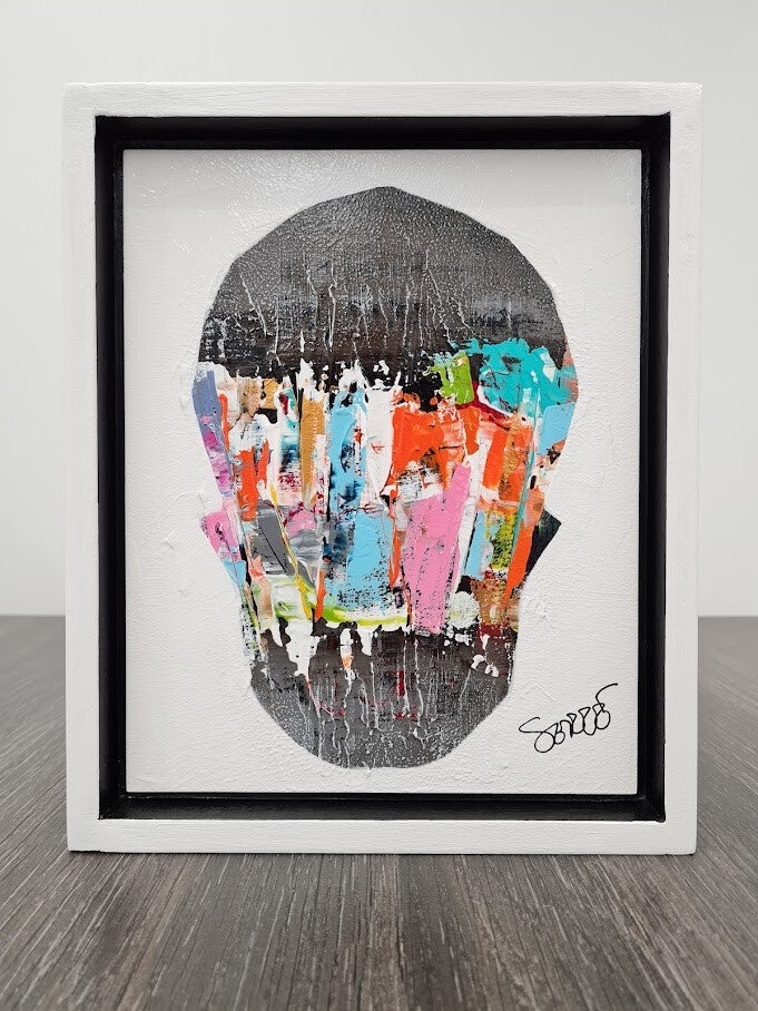 Dit compacte kunstwerk (28,5 x 23,5 x 5,5 cm) bewijst dat grootsheid niet in formaat zit. Gemaakt in acrylverf en gevormd als een krachtige schedel, straalt dit stuk eigenzinnigheid en lef uit. De glanzende vernislaag geeft het geheel een strakke, glossy finish en beschermt de details.